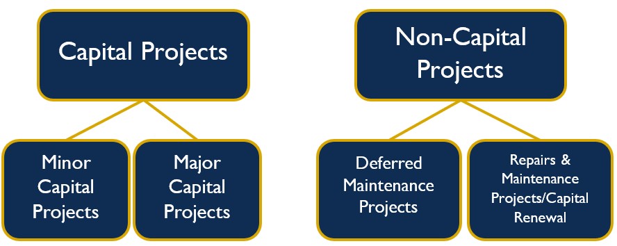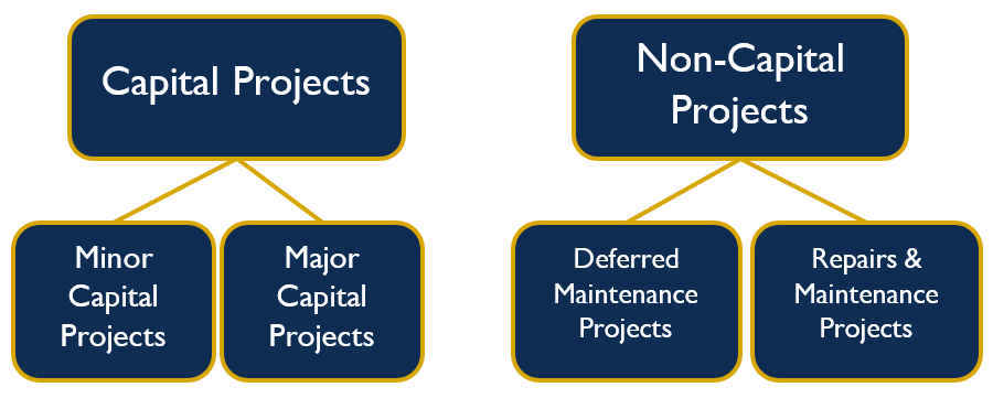 Capital Projects are categorized into major and minor capital projects, which support the development and enhancement of university facilities through construction, renovation, and infrastructure expansion. Non-capital projects include deferred maintenance and repairs & maintenance activities, focused on preserving, repairing, and extending the useful life of existing campus assets. The sections below provide an overview of each project type and its associated project codes.
