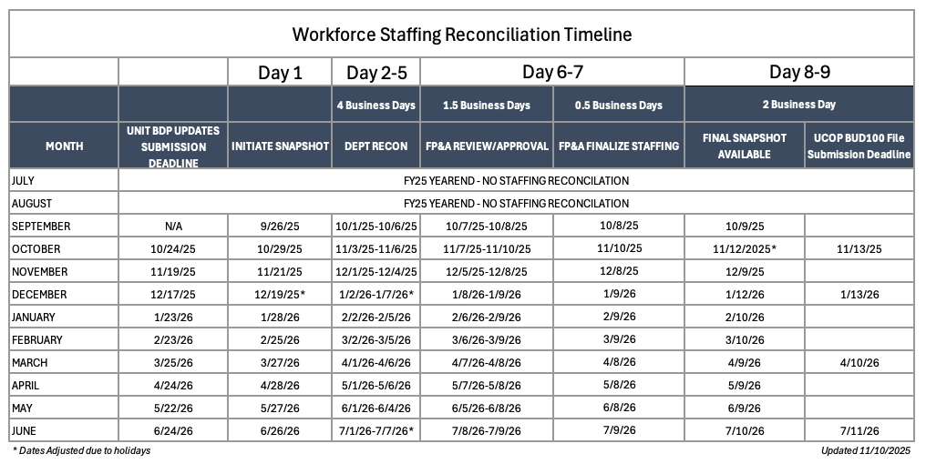 The workforce reconciliation at UC Merced is essential for financial and labor planning. It helps ensure sufficient funding is set aside for salaries and benefits for recurring budgeted positions. The reconciliation provides monthly workforce information to aid in the department’s recruitment and reclassification planning and streamline the approval process. Additionally, it fulfills reporting requirements for the State of California and UCOP, ensuring the university receives the full state funding allocation.